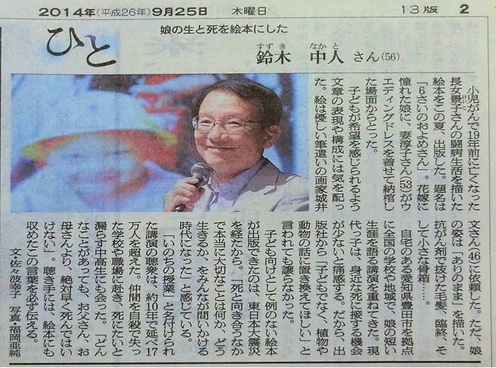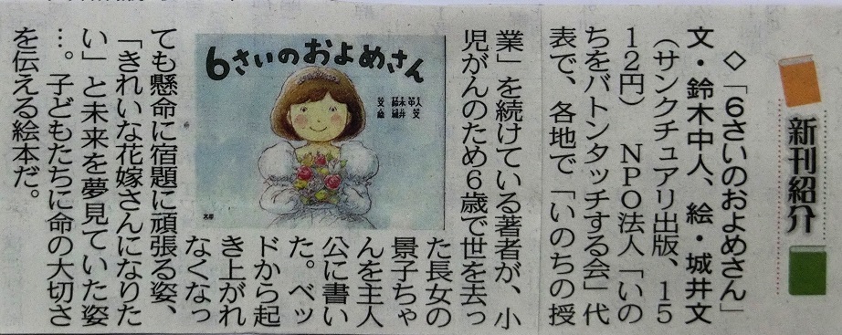 ●絵本『6さい の およめさん』 17万人が感動の涙を流した「いのちの授業」の絵本。いのちの大切さ、家族の絆、生きる力を、きっと心感じる物語です。 ・文 :鈴木 中人 ・絵 :城井 文 ・編集協力&推薦 ◆大棟 耕介 (日本ホスピタルクラウン協会理事長) ◆押谷 由夫 (日本道徳教育学会会長) ・書評 朝日新聞「ひと」 中日新聞 月刊「致知」9月号 |